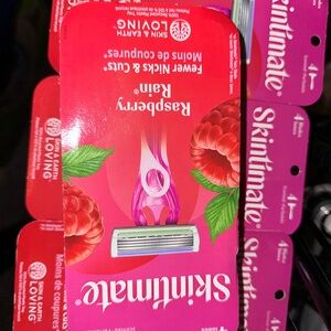 Skintimate razor blades in Raspberry Rain scent. Vibrant red packaging with raspberry imagery.