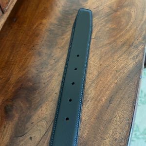 Black leather with brown lining. Silvertone buckle. Subtle blue accent stitching
