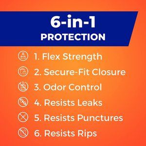 6-IN-1 PROTECTION—These Hefty trash bags offer a powerful combination of six features: flex strength, tough drawstring, patented odor control, resistance to leaks, punctures, and rips