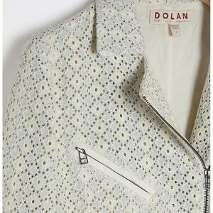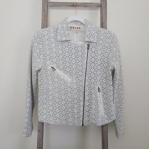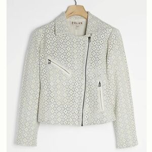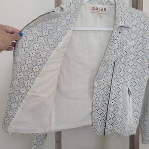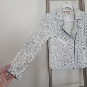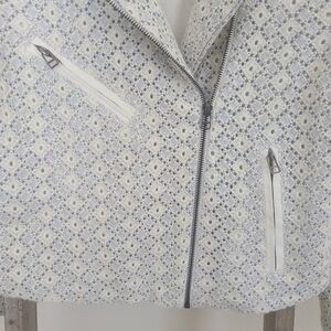 Cool take on a classic style motorcycle jacket. Sodf blue and cream cotton eyelet detail. Front zip pockets. Asymmetrical zip. NWOT.