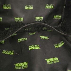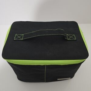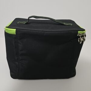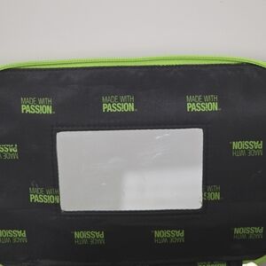 Signature Black and lime green with "Made with Passion" stamped in lining. Silver zipper pull and logo. Has interior mesh pockets and elastic brush holders. Great for storing make-up or toiletries for travel.