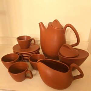 Vintage Mid-Century Terracotta Ceramic Espresso Set with Teapot, Milk Pitcher & Sugar Bowl. 4 mugs, 6 saucers. Sugar Bowl and Milk Pitcher have chips as shown in photo. Otherwise, in great condition. Brand Unknown. These are authentic from the 70s.