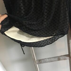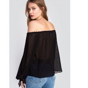Stretch off shoulder style. Bubble sleeve with ties at cuff. Sheer chiffon with tiny bow-like “dot” detail through out. Nude lining on front of top but no lining at back. Back is see through as shown in photo.