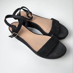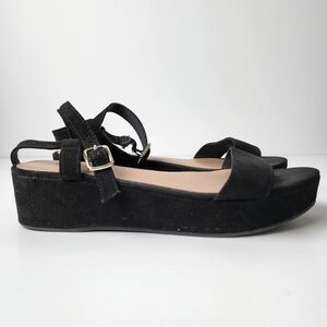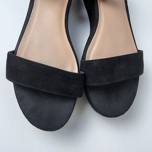Flat form heel. Black faux suede. The elastic on the ankle strap is stretched out shown in photo but otherwise good used condition.
