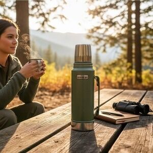 Insulated stainless travel mug by Stanley. Secure lid and wide handle for easy grip. Sleek matte charcoal finish with logo on front. Ideal for daily commutes and outdoor use.