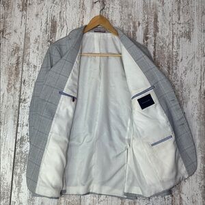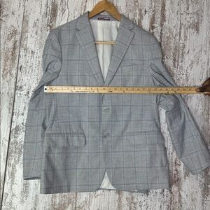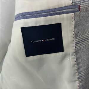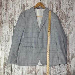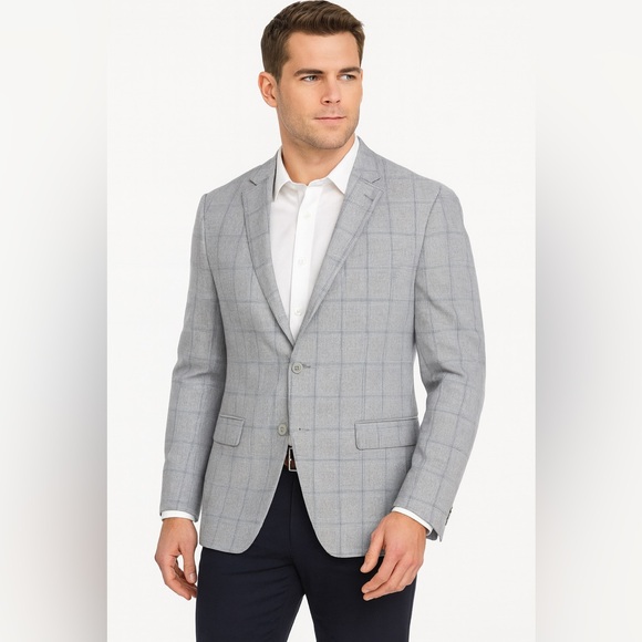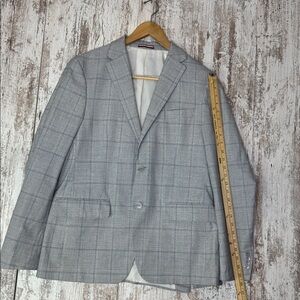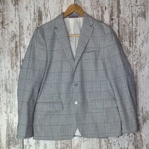 Gently used Tommy Hilfiger sport coat in a classic gray windowpane pattern. Designed with a modern tailored fit, notched lapels, and a two-button closure. The interior is fully lined, making it comfortable for work, events, or everyday polished style. Fabric shows minimal signs of wear with no major flaws. Clean, sharp, and ready to wear.
