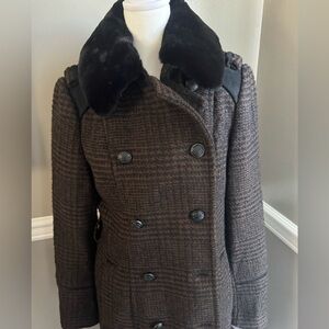 This coat is so chic. Gorgeous. Brown black plaid with a faux fur collar