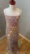 Girl/Tween champagne, pink, dusty lavender diamond pattern iridescent sequin tones with cami style mermaid train gown. 1/2 inch wide cami straps. Zip back.