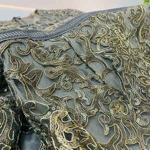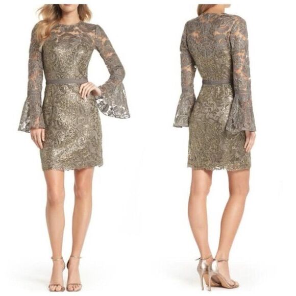 Tadashi Shoji Bell-Sleeve Lace Sequin Sheath Dress Sz 6 in Smoke Pearl Embroidered