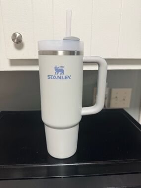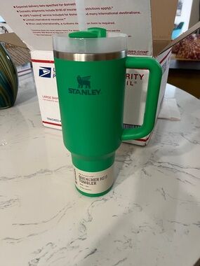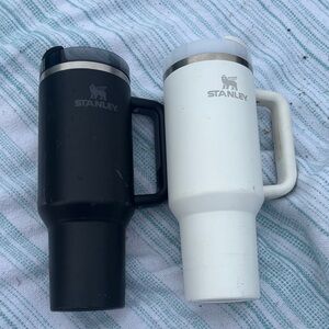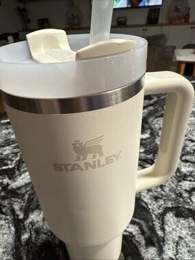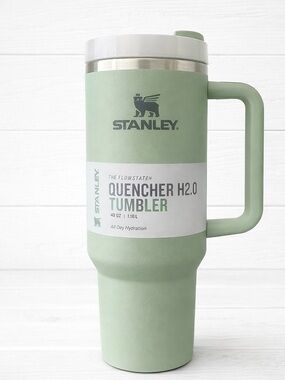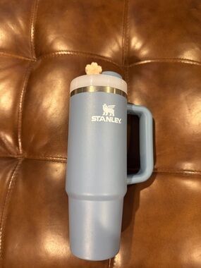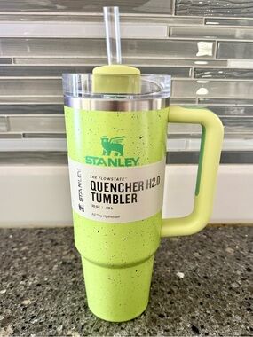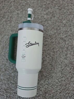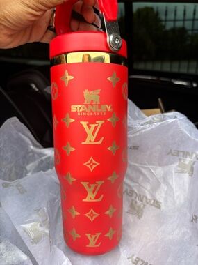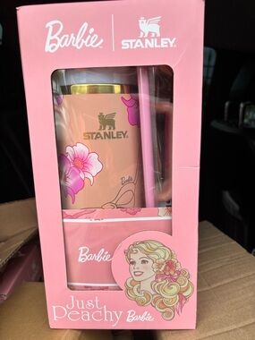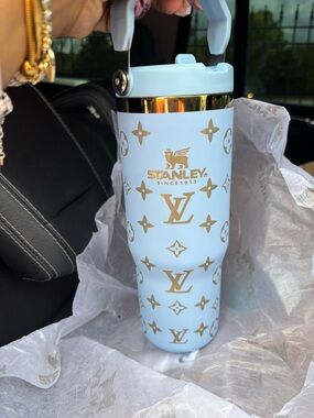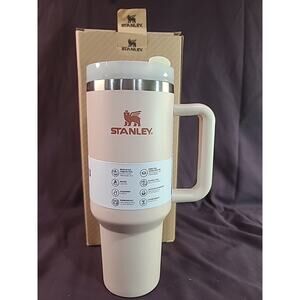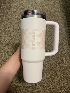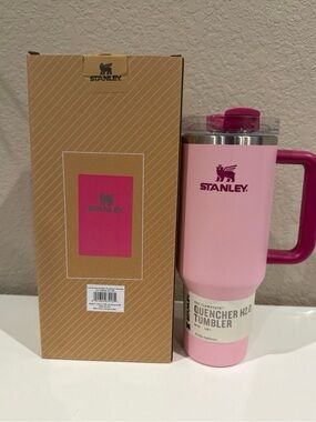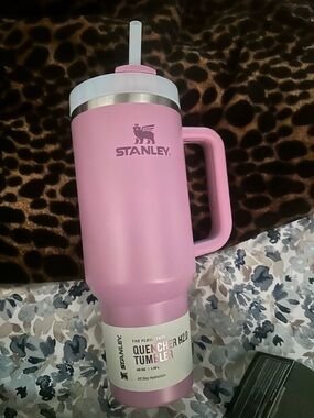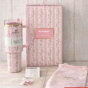 Stanley tumbler featuring a pink floral pattern. Includes handle and clear lid. Floral print with gold-tone trim. Comes with matching soft pouch, straw topper and straw.Brand new with no tags.