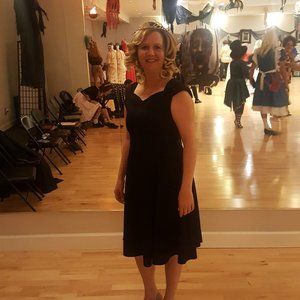 Black Party dress. Great for a night out in town. Linen style material. Sorry, it does not have any tags. I dry clean the dress. It does have a small tear at the seam in the front (see picture).