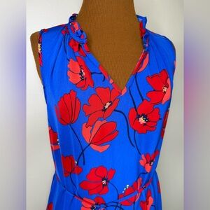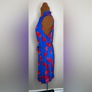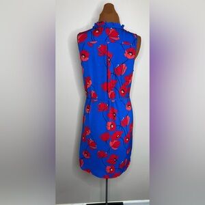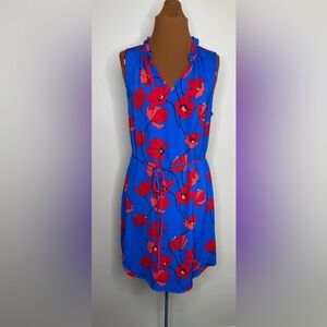 Pullover style dress in a bright royal blue with red floral print