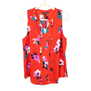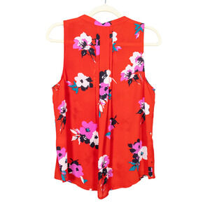 This is a red floral Breyson Pleat Detail Split Neck blouse from Stitch Fix's 41 Hawthorn brand. It is a sleeveless blouse with a V-neckline and pleated accents. Style WGW10322