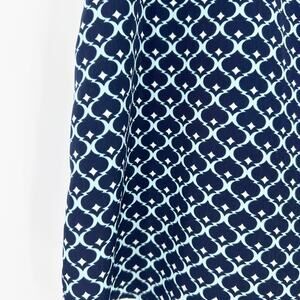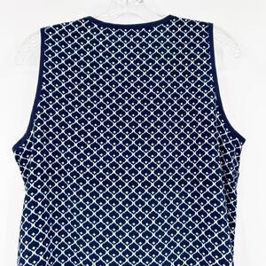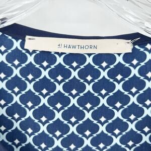 41 Hawthorn Beckett womens blouse in navy blue geometric. Chic and versatile, this 41 Hawthorn Beckett sleeveless blouse features a navy blue geometric trellis print with a split V-neckline. Crafted from lightweight 100% polyester, it’s perfect for layering under blazers and cardigans for work, or wearing solo on warm days. A flattering, easy-care piece that transitions seamlessly from office to casual wear. Size small. Excellent used condition. No flaws detected. See measurements for proper fit.