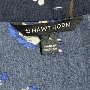 Good used condition, with no stains or tears. A sleeveless navy blue floral dress. Has a split neck with henley buttons and a drawstring waist. From Stitch Fix.