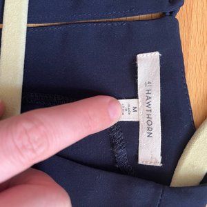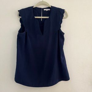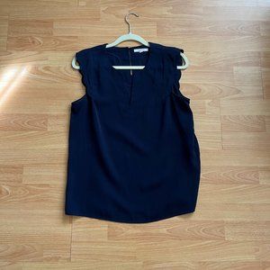 Solid navy, slit neckline, sleeveless, scallop shoulder hem detail, loose fit, back button-loop closure, lined, non-sheer, non-stretch, business casual, office wear
