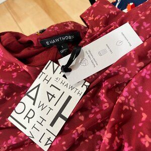 41 Hawthorn Floral Ruched Midi Mesh Overlay Dress Berry Red Pink Size Large NWT