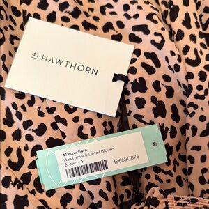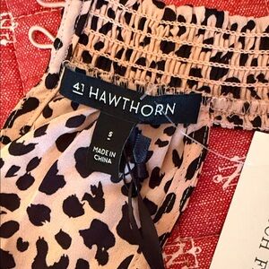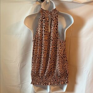 Stylish halter blouse with leopard print. Features a gathered neckline and hem. Perfect for a chic look.
