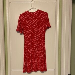 Casual red midi dress with a delicate pattern. Features a flattering V-neckline with faux wrap. Perfect for versatile styling.
