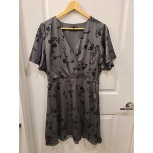 Gray faux wrap dress with black floral pattern on silky satin fabric. Cottage core dress has playful flutter sleeves and slimming silhouette. Mini dress length hit just above the knees. Pullover style with side zipper.