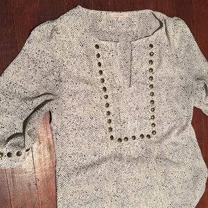 41 Hawthorn from Anthropologie mid sleeve shirt (not quite short sleeve, not quite 3/4 sleeve). Polyester. White with black dotted chevron pattern & bronze accent buttons. Good condition.