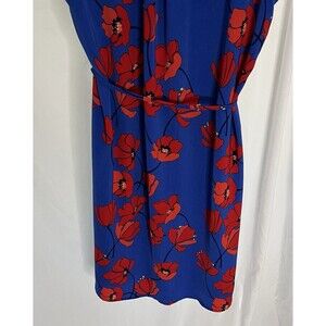 41 Hawthorn, floral dress, sleeveless, belted, sheath dress, casual dress, workwear, summer dress, womens medium, blue dress, red flowers, knee length, wedding, summer party, resort, vacation