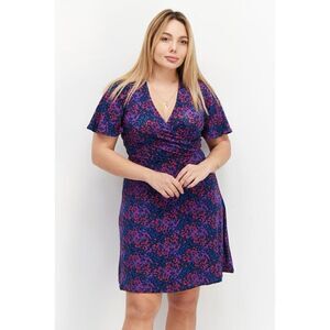 Hawthorn Women’s Purple Blue Floral Surplice Midi Dress Short Sleeve Size L NWOT