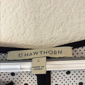 This elegant white blouse from 41 Hawthorn features a relaxed fit with 3/4 sleeves and a sophisticated mandarin collar. White with black polka dots. Semi sheer. Polyester and spandex blend. The black trim down the center gives the blouse a slimming look.