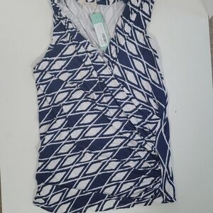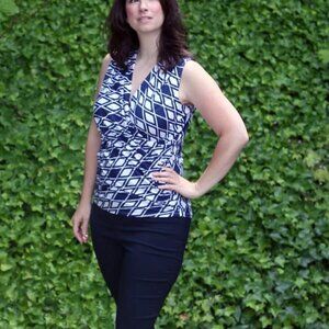 41 Hawthorne Navy White Diamond Pattern Cross Surplice Front Sleeveless Knit Top