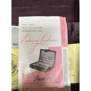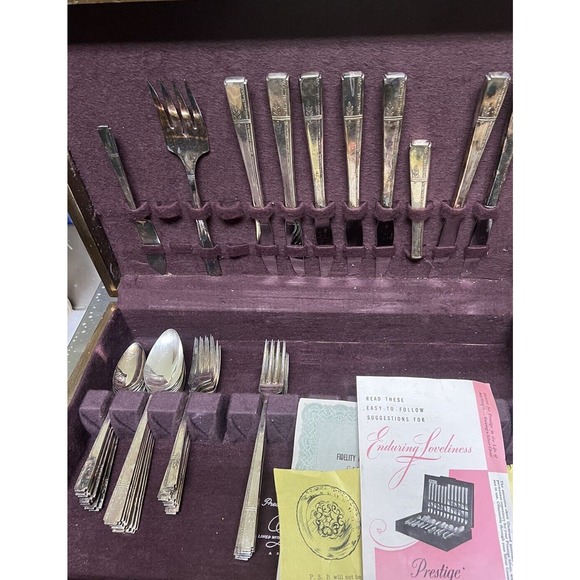 This 41-piece vintage silverplate flatware set by Prestige is a beautiful addition to any collection. The set features the Grenoble pattern and comes in its original box. Each piece is crafted with care and attention to detail, making it a wonderful choice for both use and display.