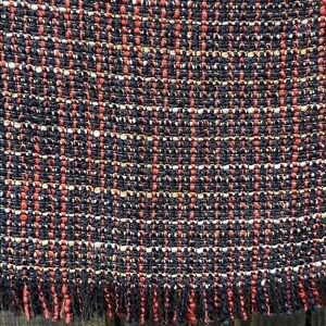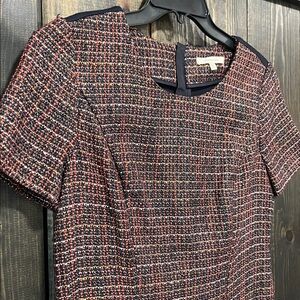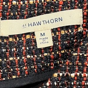 41 Hawthorn brand tweed blouse. Size medium. Black & red with gold glitter threads. Metallic sparkle. Thick stretch material. Fringe hem. Dressy. Short sleeves. Zipper back. Great for the office. Looks great with trousers, skirts or jeans. Preloved. Please see all photos for condition. Approximate Flat Measurements: Pit to Pit: 18.5 inches Length: 26 inches Fall Winter Spring Boho Bohemian Festival Office Casual Holiday Party Preppy Dark Academia Old Money Shimmer / Sparkly Festive Neutral Heritage Stitch Fix 15oz
