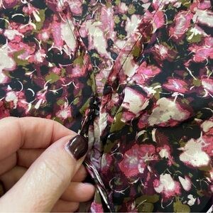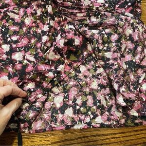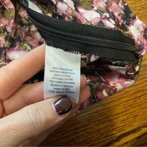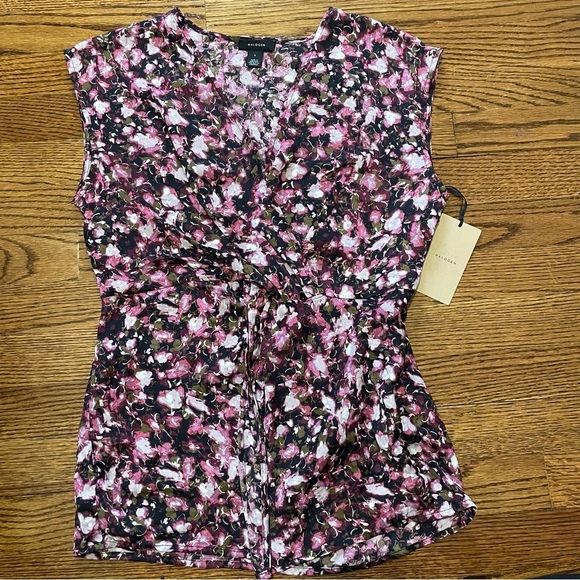 This is a ladies floral print, wrap style blouse. The blouse is sleeveless, has a hidden closure at the bust line for modesty, has a wrap style closure at the waist. The blouse zips at the side, and v cut in the front. It is a size small and is new with tags. The blouse is 100% polyester.