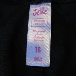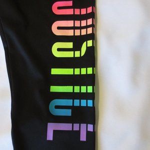Color-Black with JUSTICE written in rainbow letters on the leg