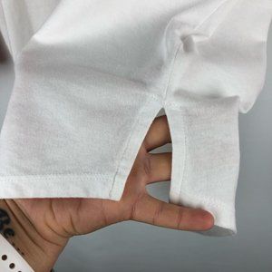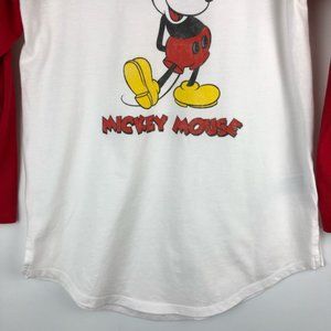 White and red raglan style t-shirt featuring an iconic Mickey Mouse graphic. Disney distributed by Old Navy. Curved hem with splits on each side. 3/4 length baseball style sleeves.