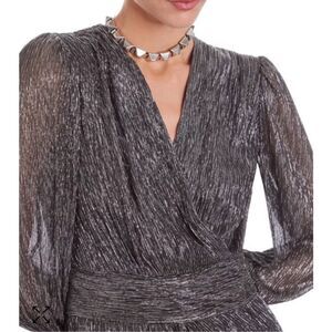 • Metallic Plisse Mini Dress in silver with surplice neckline and button cuffs