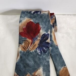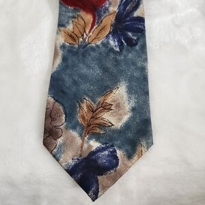417 By Van Heusen Silk Floral Flower Blue Tan Burgandy Necktie Tie. Perfect for a wedding, dance, prom or work! Deep hues of blues with leaves & flower designs. 100% silk. 3.5" widest end of the tie. No rips, snags or stains. Like new condition!