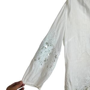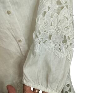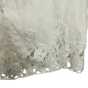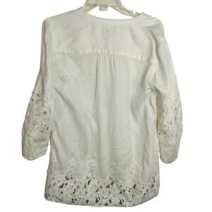 4172)Charter Club White Linen Crochet 3/4 Sleeve Split Neck Buttn Up Tunic Top M