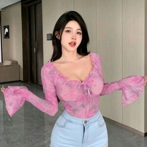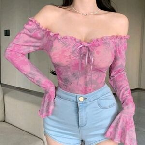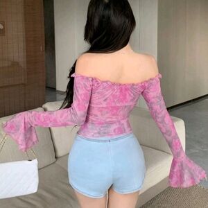 womans size XL brand new from shein pink florap pattern sheer mesh off the shoulder blouse