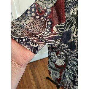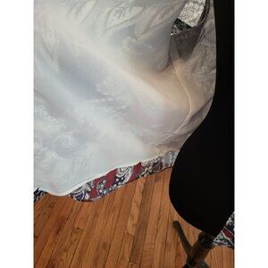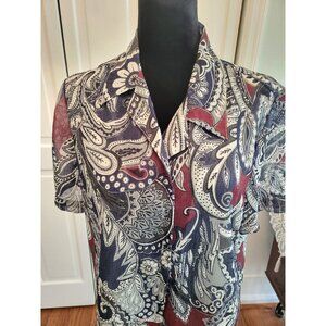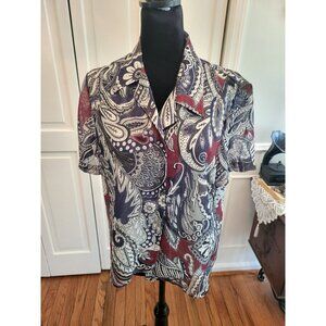 Elevate your wardrobe with this Alfred Dunner button-up. Featuring a vibrant red and white paisley design, this top is perfect for summer celebrations. New with tags, this stylish piece offers both comfort and chic appeal. Bodice of blouse is fully lined, but sleeves are sheer.