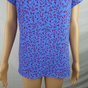 Machine washable polyester, lightweight with no stretch. Gorgeous shade of blue with ruffle detail around the neck, split neck, and short tulip sleeves. All over darkish red/pink floral vine print. High low hem. S531873B