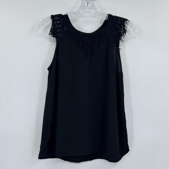 41Hawthorn Jarred womens blouse in black. Featuring delicate lace neckline and eyelash lace shoulders, this sleeveless top blends romantic style with modern versatility. The lightweight fabric and cap sleeves make it perfect for both office wear and evening outings. Size XSP. Excellent used condition. No flaws detected. See measurements for proper fit.