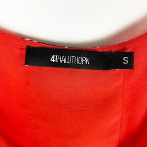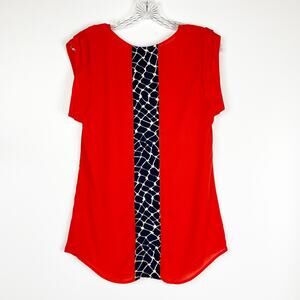 41Hawthorn womens blouse in red with navy and white stripe. Lightweight blouse made of 100% polyester. Sleeveless. V neck. Size small. Excellent used condition. No flaws detected. See measurements for proper fit.