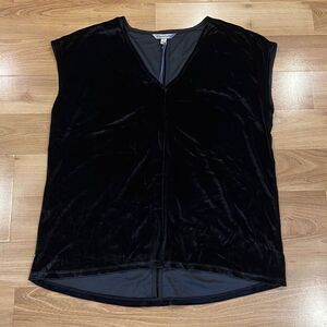 New black polyester/spandex blend velour sleeveless blouse with v-neckline. Size US M but measurements taken flat are approximately 22.5” across chest, 23” long in front, 25.5” long in back.