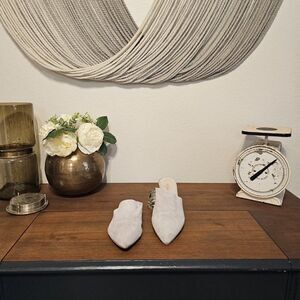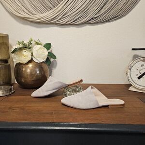 42 Gold Gray Suede Pointed Mules Sz 6. Excellent, pre-owned condition.