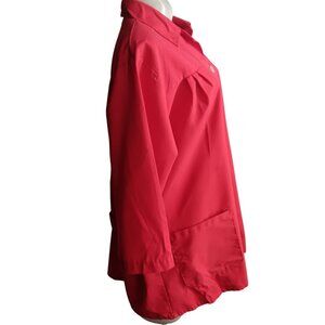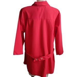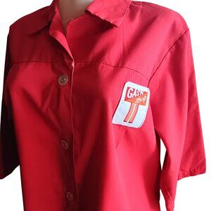 This vintage uniform shirt jacket features a bold red color and retro "Gas'n Shop" logo patch. Durable polyester-cotton blend for comfort and longevity.