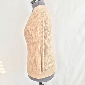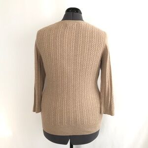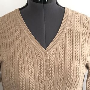 Croft & Barrow tan 3/4 length sleeve knit sweater with three buttons in front below the v-neckline. Gently used...size large...no flaws noted...RN 73277...See photos for care details.