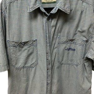 This vintage Levi's Men's short sleeve shirt is in great condition. The colors appear to be a green/tan combination. This shirt has the green Levi's label. The closure down the front is silver buttons with buttons on the cuff as well. There are two front pockets with metal buttons and a label at the bottom of the shirt that says modern authentics. The words Levi Strauss are embroidered on the left front pocket. The measurements are: armpit to armpit 23", Length 28 1/2 inches, sleeves 11".