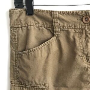 Loft tan mini skirt with pockets in front and back. It has a button and zipper for closure in front and belt loops. Gently used...size 8...no flaws noted...see photos for care details...112619