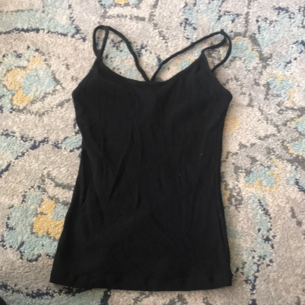 Black ribbed tank top that has extra straps that go over chest areas