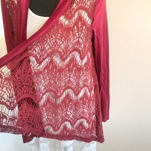 Lace front cardigan from Rue 21. Fuchsia colored. Shorter in the front. Front is all lace. Back and sleeves are all solid. Long sleeves. Good used condition. Juniors size medium. 95% polyester and 5% spandex. Comes from a pet friendly, smoke free home.